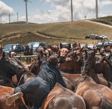 Comienzo de la rapa después de comer, separación de potros y marcado a fuego, saca de las yeguas y desparasitación. Suelta y vuelta al monte.